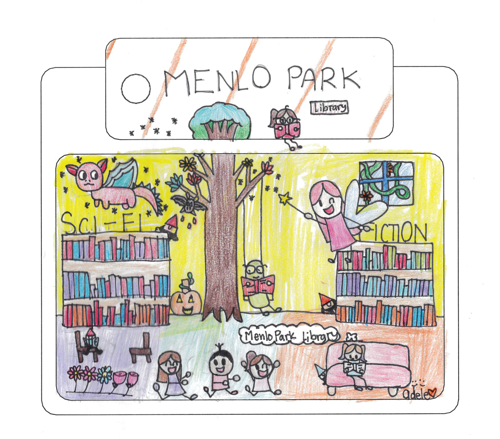 Child's illustration of a library, with sci-fi and fiction shelves, a dragon, a fairy, and happy children.