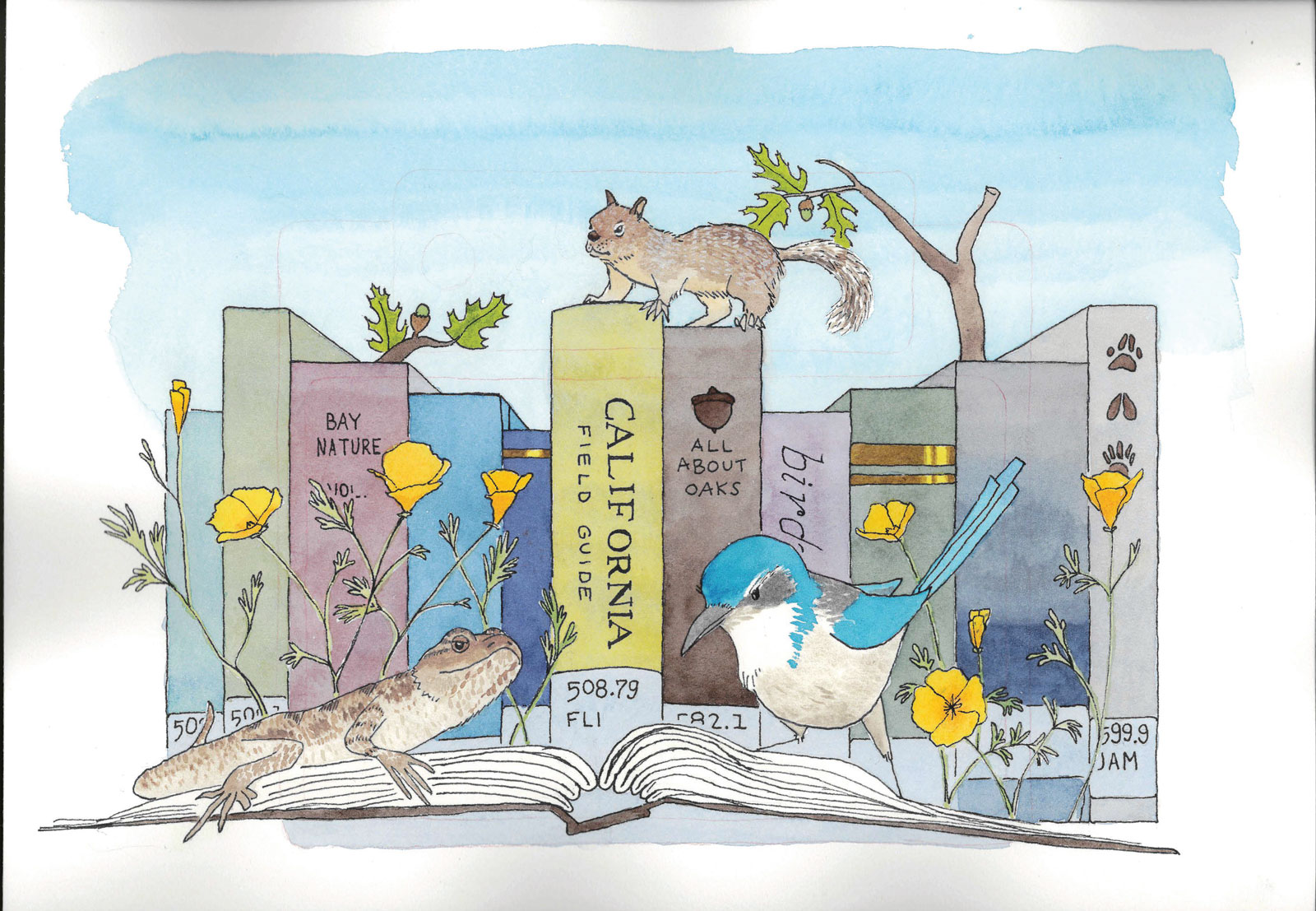 Watercolor art of books about California, with a lizard, squirrel, bluebird, and poppies.
