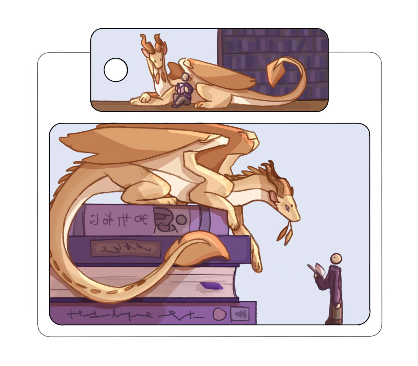 Digital art of a dragon perched on a stack of books looking down at a person. The dragon and person are reading together in the keychain card.